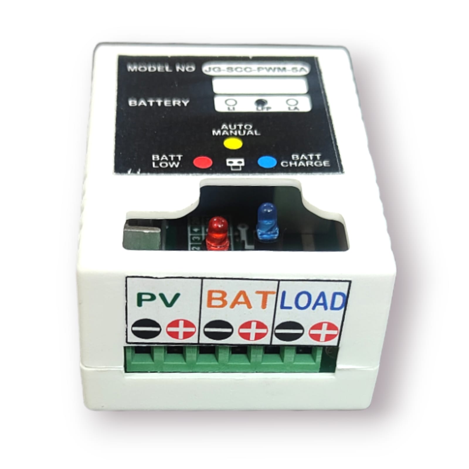 12V, 5A Solar PWM Solar Charge Controller With overcharge/discharge protection. Compatible with Lithium Battery, Lithium Phosphate Battery, LFP, LiFePO4, Lead Acid battery. Manual or Auto Dawn to Dusk Mode available with jumper pin (Switch)